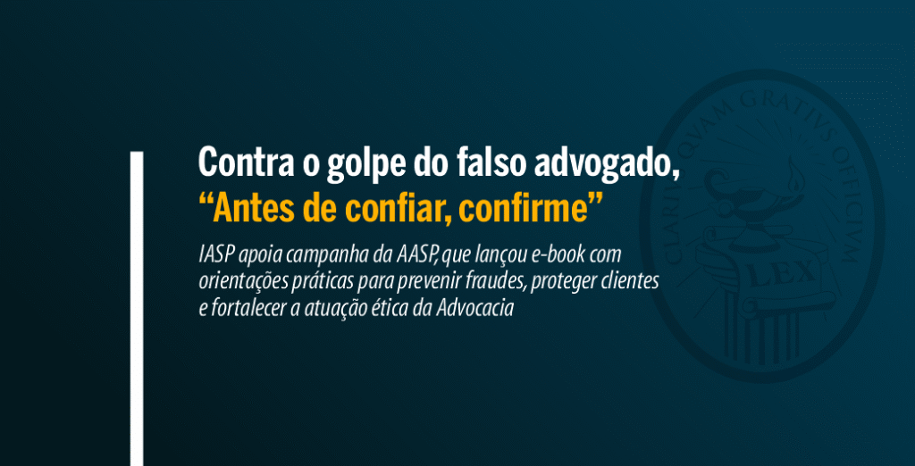O golpe do falso advogado vem crescendo no país. Criminosos utilizam dados reais de processos para enganar vítimas e solicitar pagamentos indevidos. Diante do aumento expressivo dessas fraudes, a Associação dos Advogados de São Paulo (AASP) lançou a campanha “Antes de confiar, confirme”, com um e-book educativo e gratuito voltado à orientação da sociedade civil e apoio do IASP.
