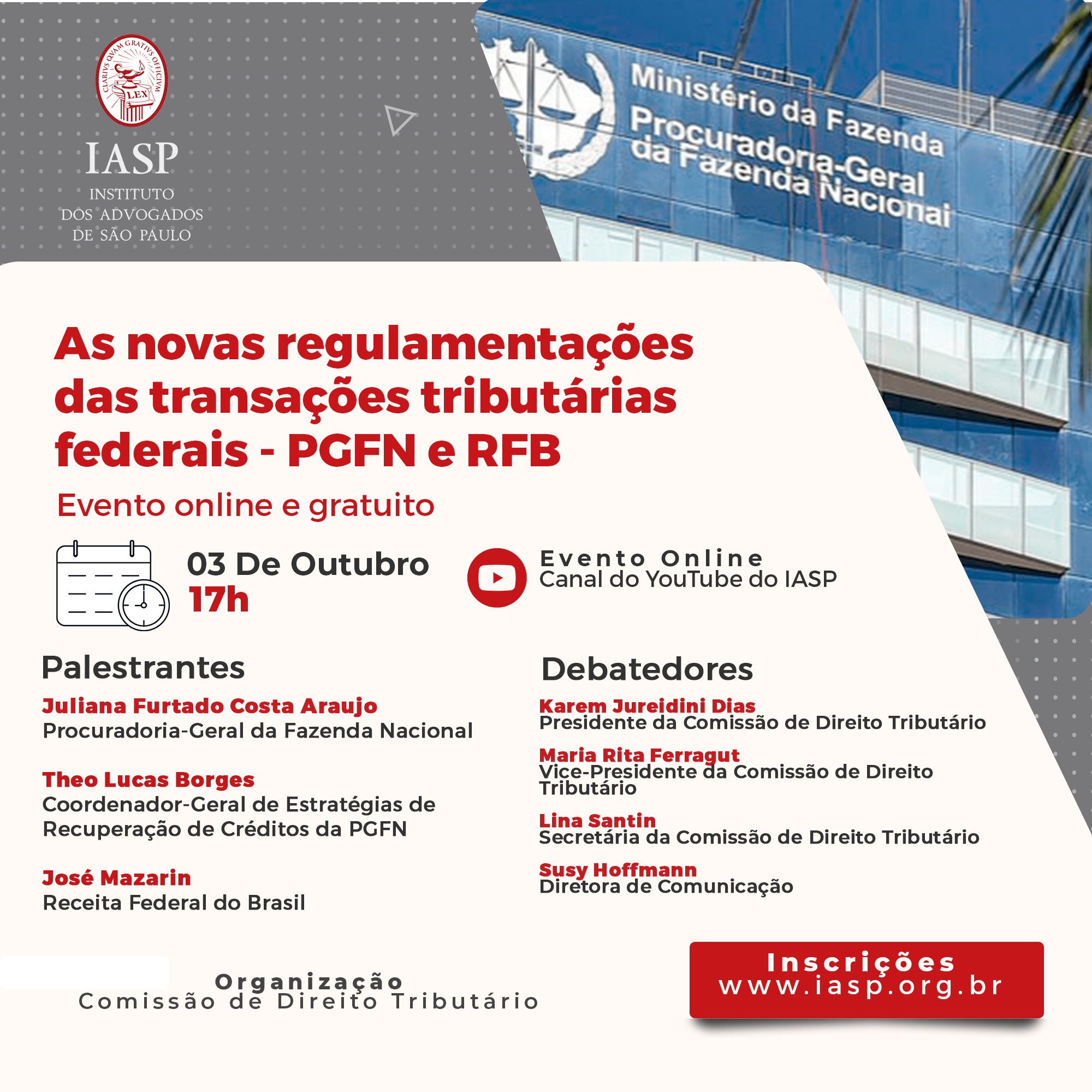 No dia 03 de outubro de 2022, com início às 17h, o IASP realizará a palestra com o tema “As novas regulamentações das transações tributárias federais – PGFN e RFB“, um evento online e gratuito, com organização feita pela Comissão de Direito Tributário.