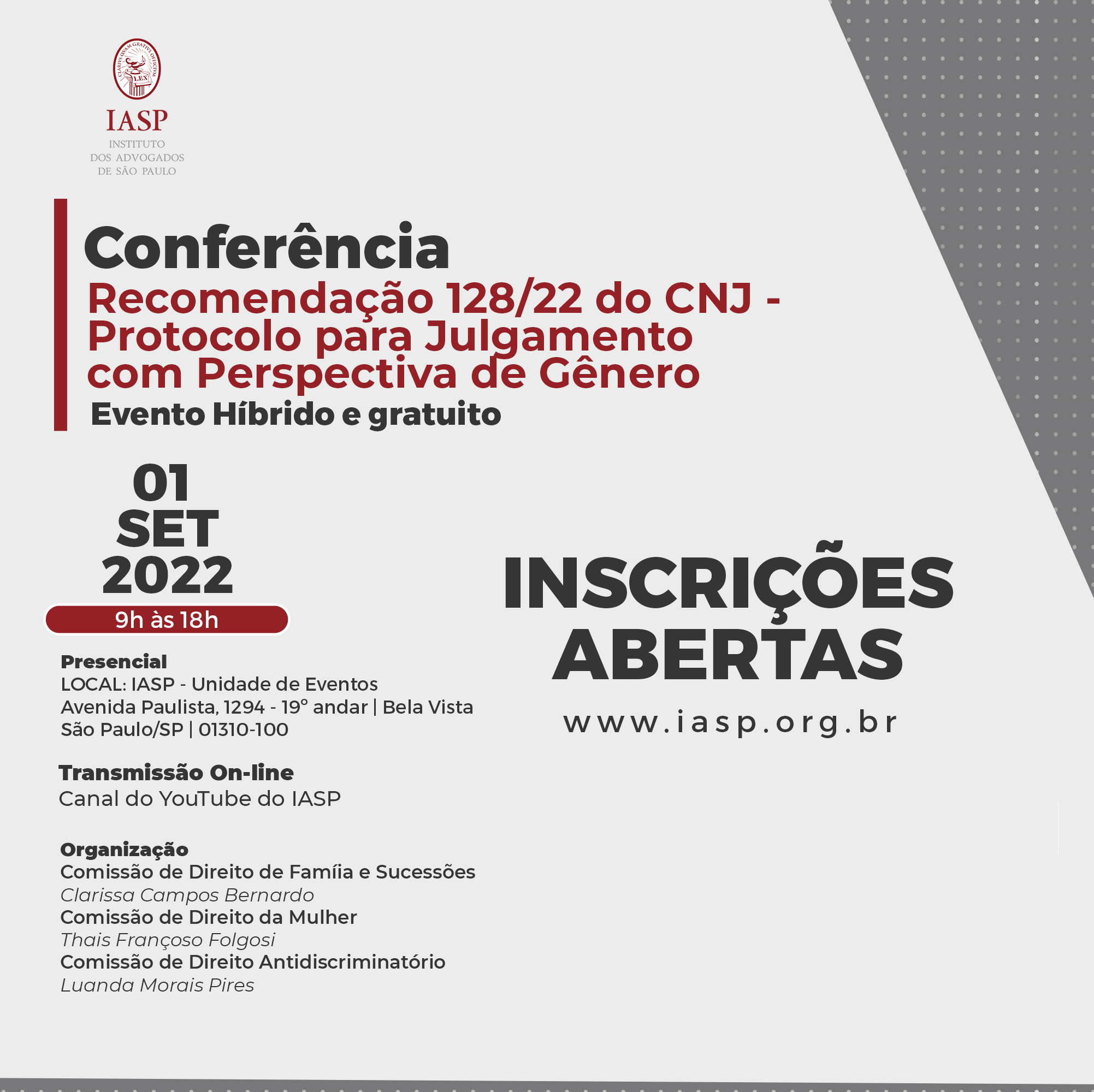 No dia 1º de Setembro de 2022, das 9h às 18h, o IASP realizará a Conferência Recomendação 128/22 do CNJ – Protocolo para Julgamento com Perspectiva de Gênero.