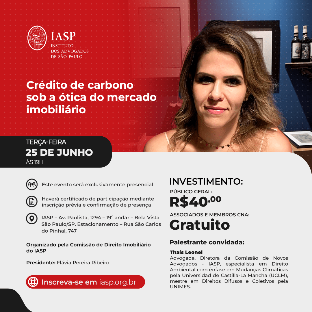 O IASP convida a todos para o evento Crédito de carbono sob a ótica do mercado imobiliário que será realizado no dia 25 de junho (terça-feira), às 19h. Este evento será realizado de forma exclusivamente presencial.