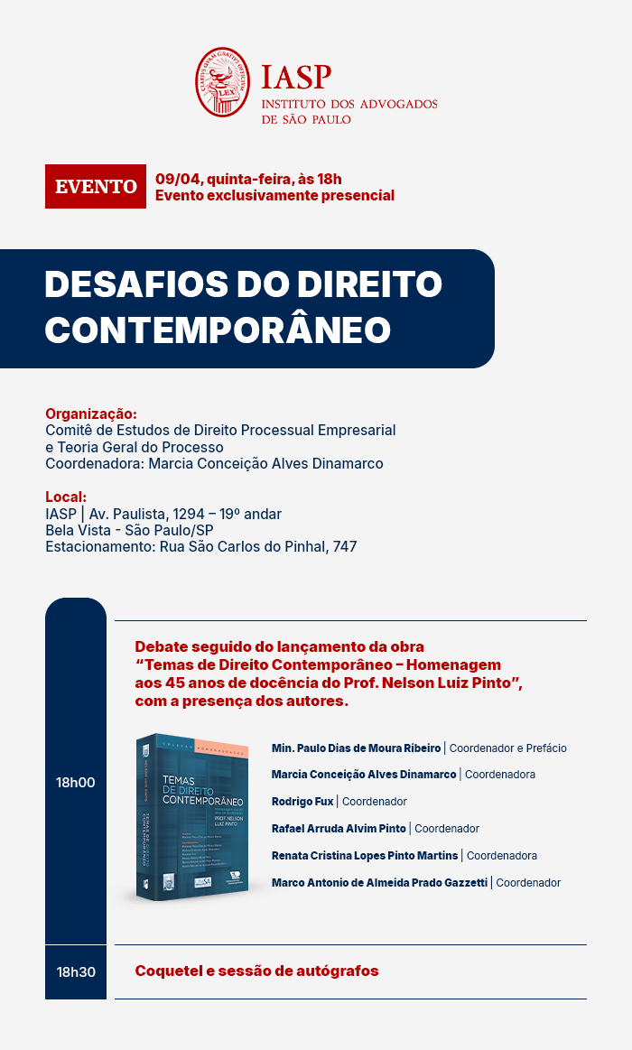 Obs.3: O conteúdo desta página é propriedade do IASP, sendo proibida a reprodução, publicação, distribuição, difusão, total ou parcial de material disponibilizado em qualquer espaço do site do Instituto dos Advogados de São Paulo, por meio eletrônico, impresso, fotográfico, gravação ou qualquer outra forma que possa tornar os conteúdos dos materiais acessíveis a terceiros, para fins particulares ou comerciais, bem como disponibilizá-los em serviços online, websites, fóruns de discussão, e-mails, message board (quadro de mensagens), redes sociais, comunicadores instantâneos e todo e qualquer sítio virtual, sem a prévia autorização dos autores. Todos os direitos reservados.