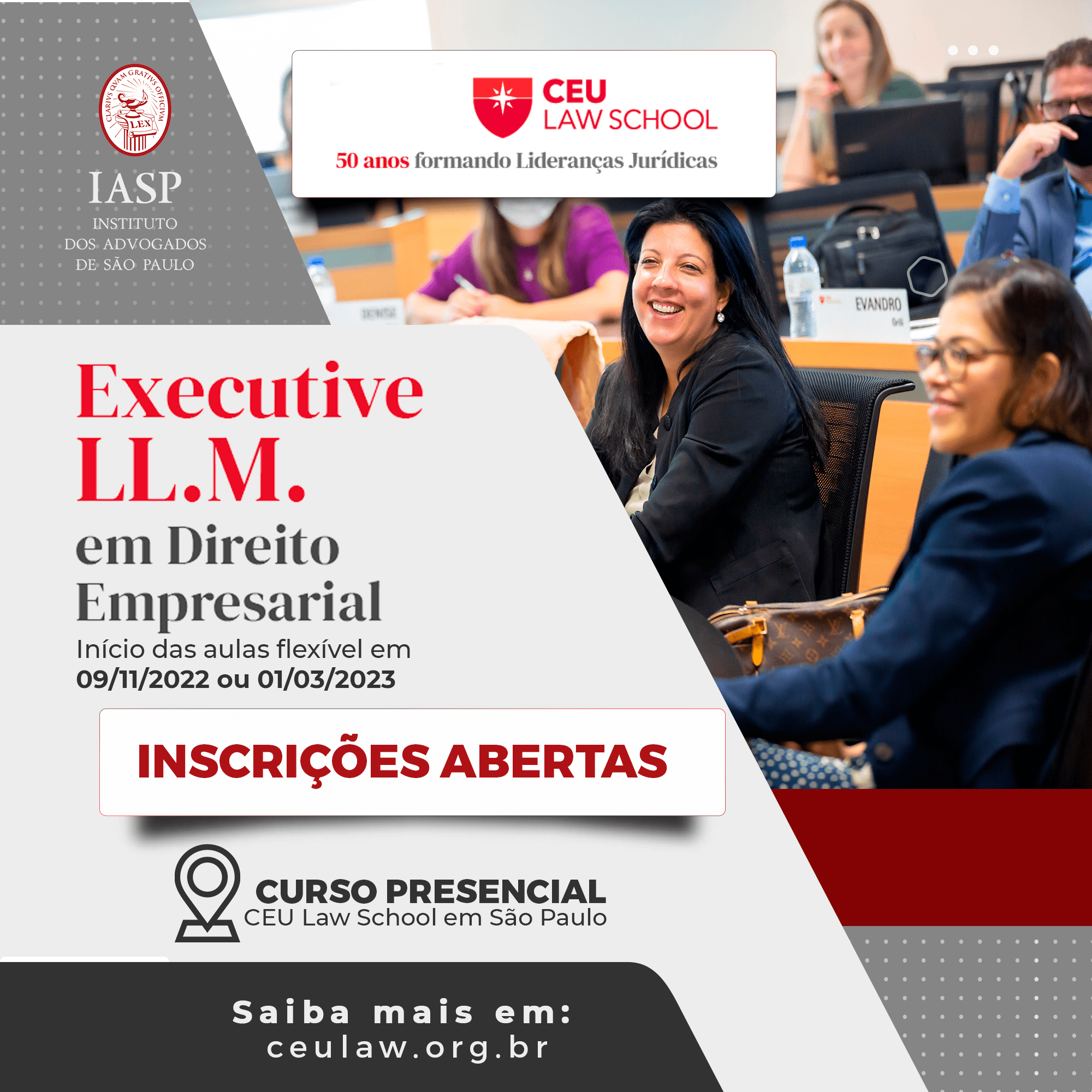 Primeiro e único no Brasil, o Executive LL.M. em Direito Empresarial desenvolverá em você competências de liderança e fortalecerá sua visão jurídica estratégica, permitindo que você possa impactar positivamente na sustentabilidade, na ética e na governança dos negócios. Início das aulas flexível em 09 de novembro de 2022 ou 1º de março de 2023 e formatura em 09 de agosto de 2023.