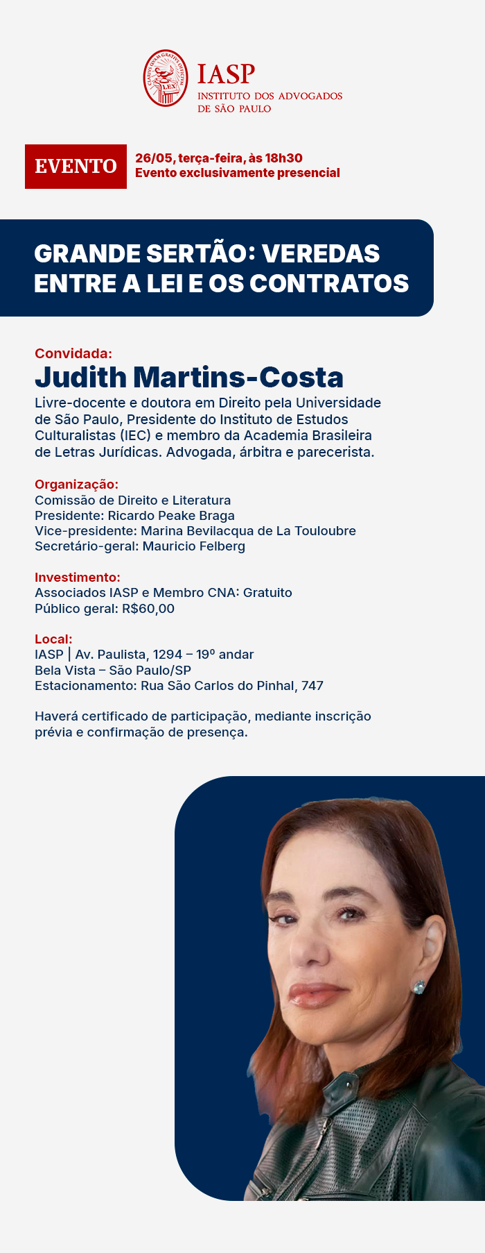 Investimento: Associados IASP e Membro CNA: Gratuito | Público geral: R$60,00