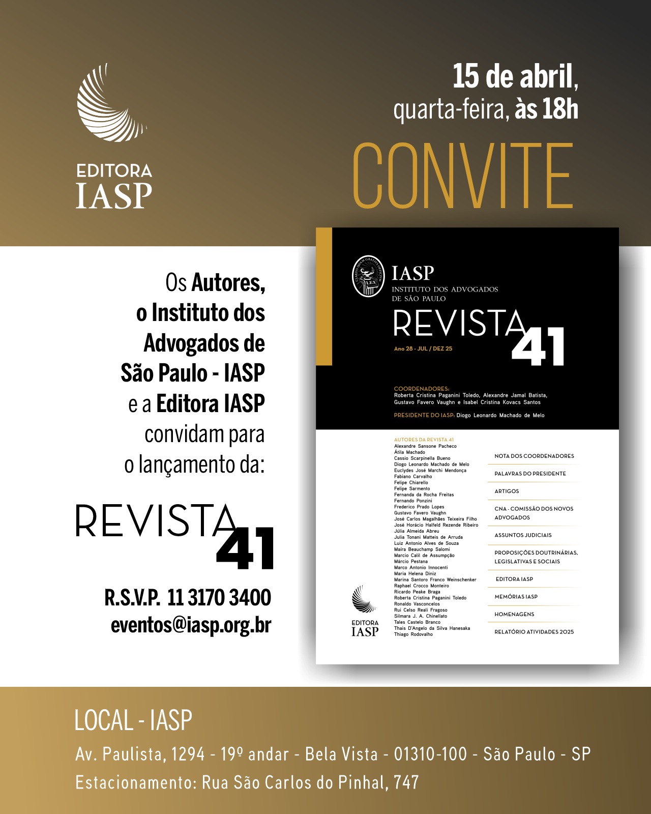 Os Autores, o Instituto dos Advogados de São Paulo – IASP e a Editora IASP convidam para o lançamento da Revista 41.