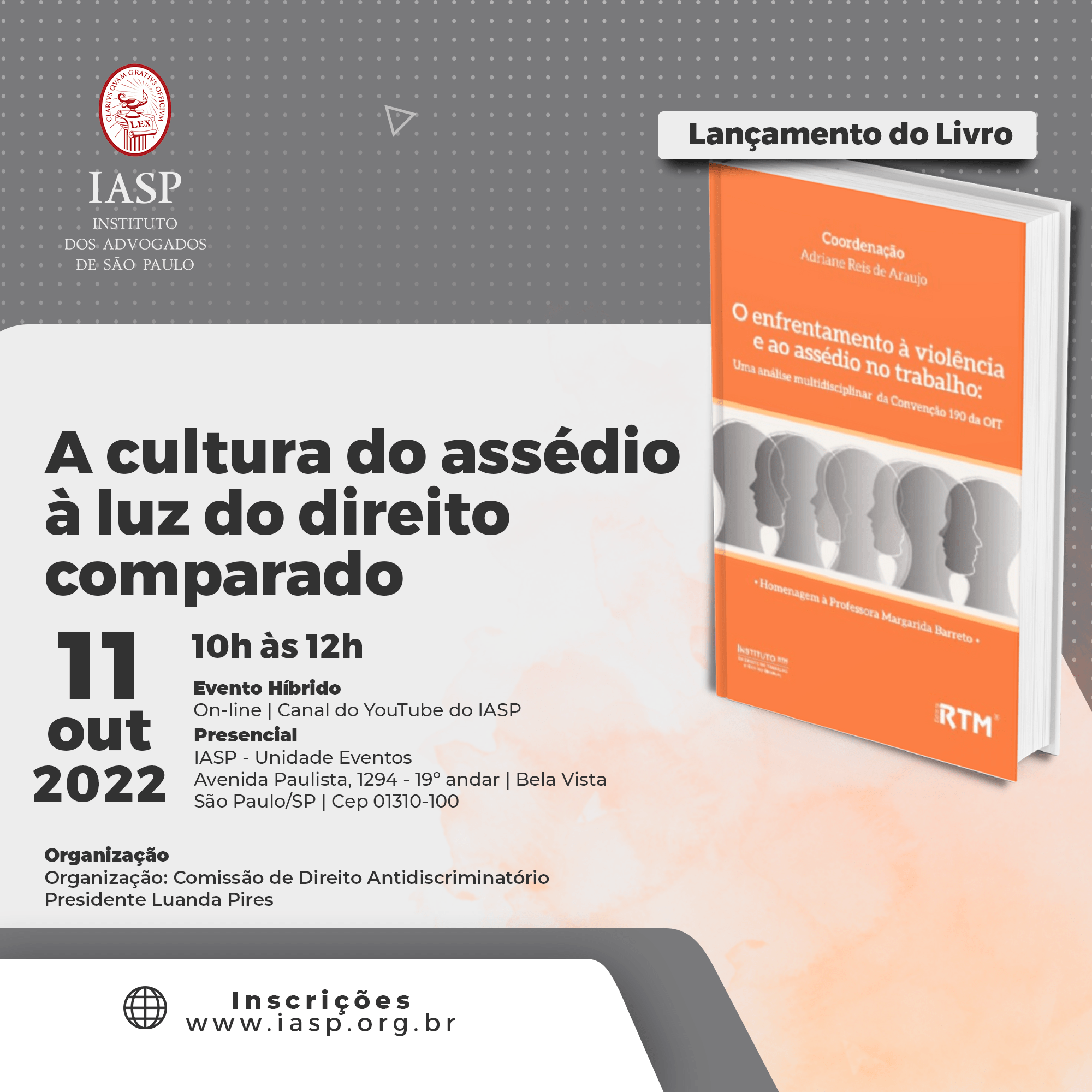 O IASP gostaria de te convidar para o evento “A cultura do assédio à luz do direito comparado” e para o lançamento do livro “O enfrentamento à violência e ao assédio no trabalho: uma análise multidisciplinar da convenção 190 da OIT “, um evento com organização da Comissão de Direito Antidiscriminatório, pela presidente Luanda Pires.