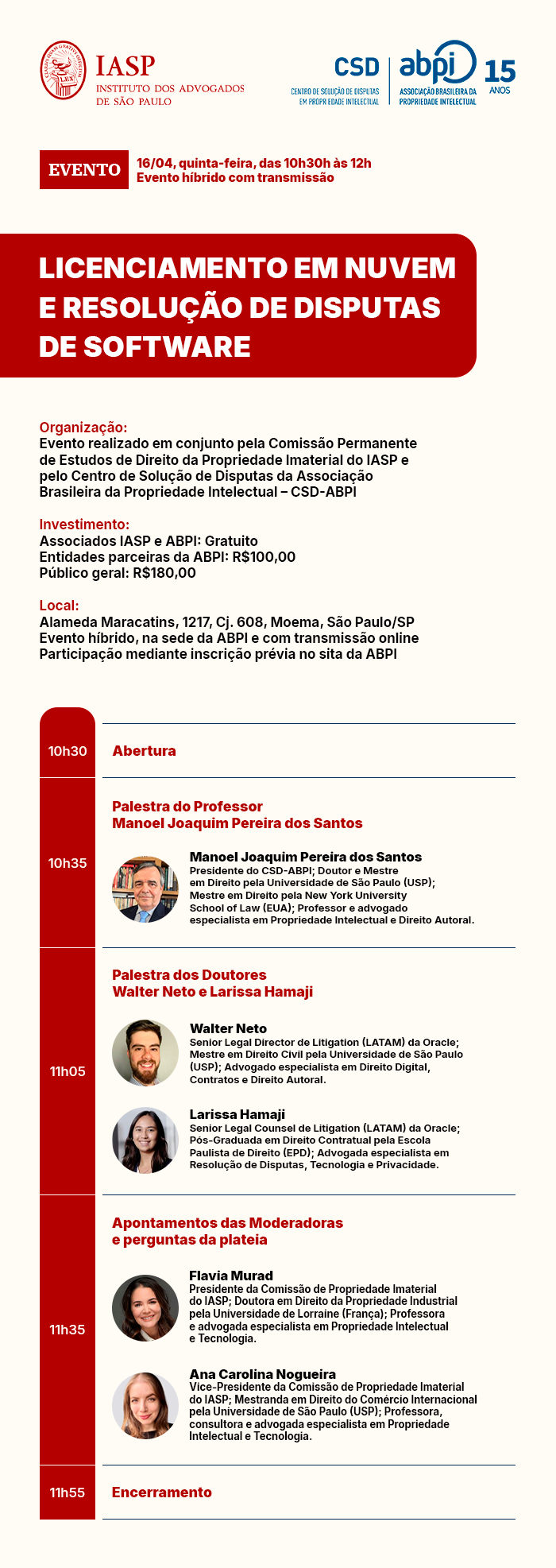 Evento realizado em conjunto pela Comissão Permanente de Estudos de Direito da Propriedade Imaterial do IASP e pelo Centro de Solução de Disputas da Associação Brasileira da Propriedade Intelectual – CSD-ABPI