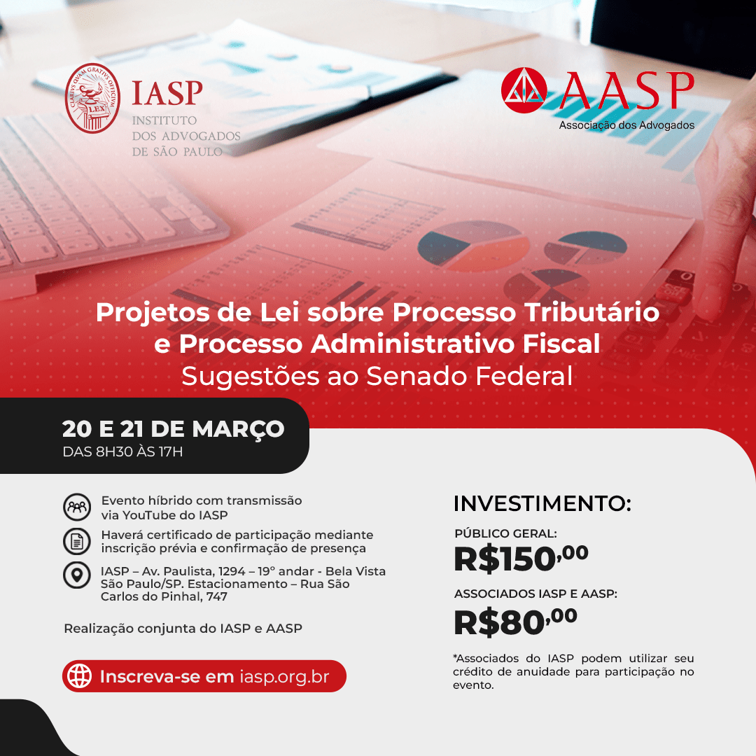 O IASP convida a todos para o evento Projetos de Lei sobre Processo Tributário e Processo Administrativo Fiscal – Sugestões ao Senado Federal que será realizado nos dias 20 e 21 de março, das 8h30 às 17h.