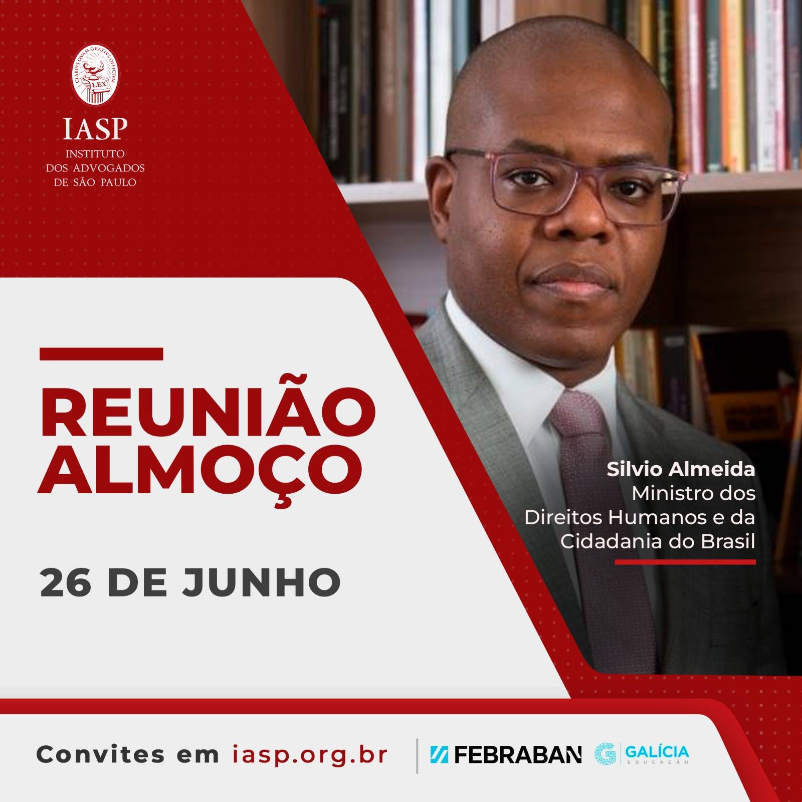 O IASP convida todos para a próxima Reunião-Almoço, que ocorrerá no dia 26 de junho de 2023, segunda-feira, no Hotel Intercontinental. O palestrante convidado pelo IASP é Silvio Almeida, Ministro dos Direitos Humanos e da Cidadania do Brasil.