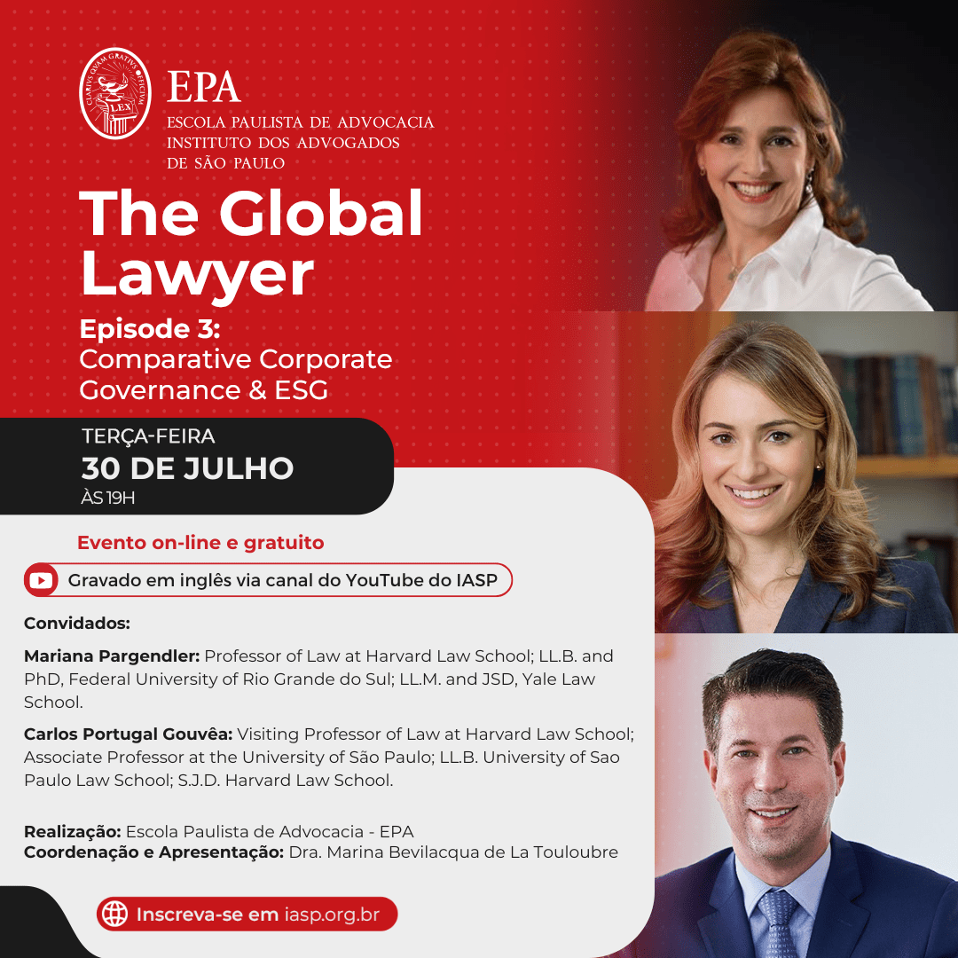 O IASP convida a todos para o evento ‘The Global Lawyer – Episode 3: Comparative Corporate Governance & ESG‘ que será realizado no dia 30 de julho (terça-feira), às 19h00.