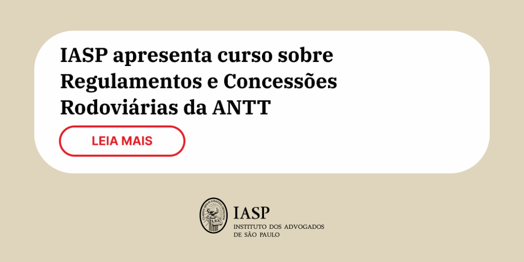 O Instituto dos Advogados de São Paulo (IASP), por meio do seu Comitê de Rodovias da Comissão de Direito Administrativo e Infraestrutura, irá ministrar o curso “Os Regulamentos de Concessões Rodoviárias (RCR) da ANTT”. Serão cinco sessões, às quartas-feiras, das 18h30 às 20h, nos dias 01, 08, 15, 22 e 29 de outubro, todas gratuitas e com transmissão via Canal do YouTube do IASP.