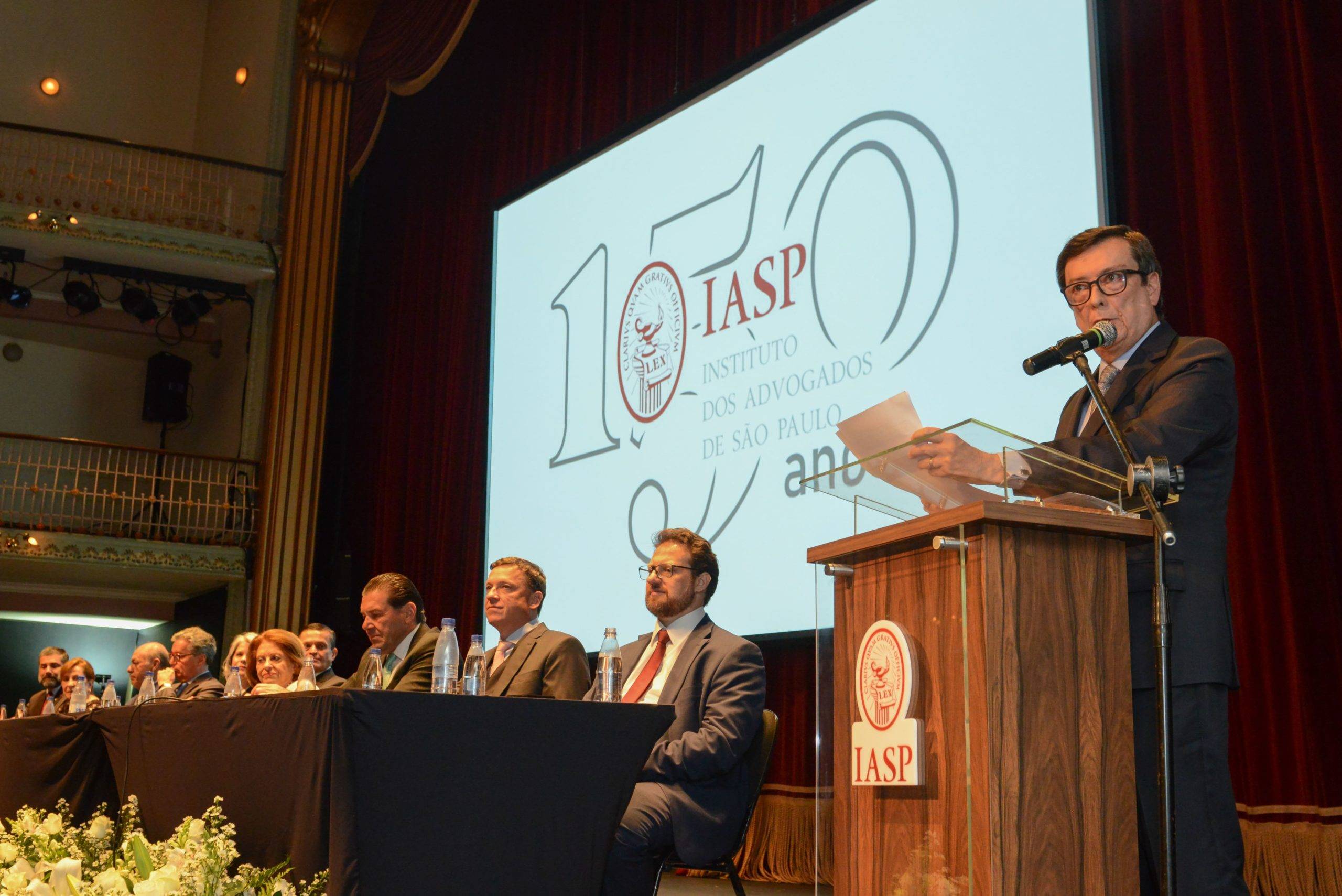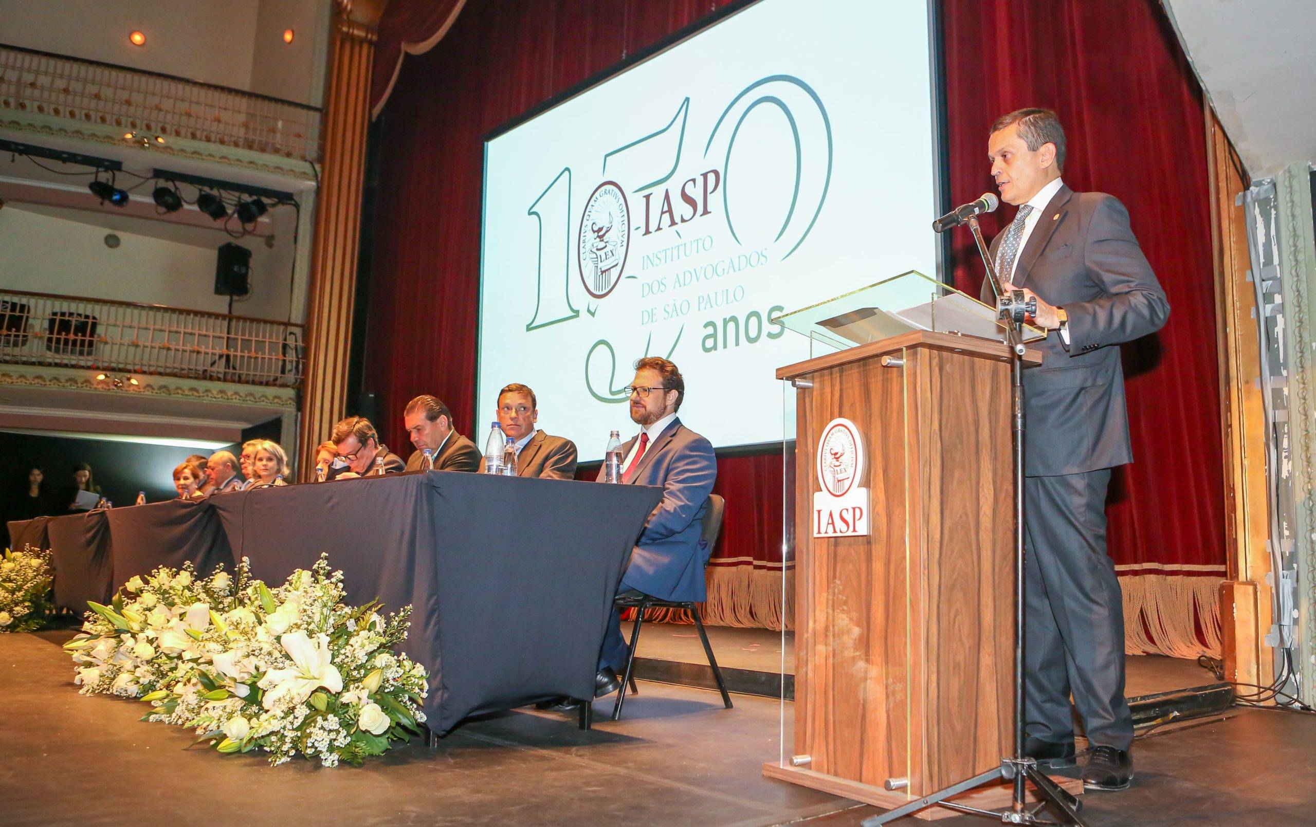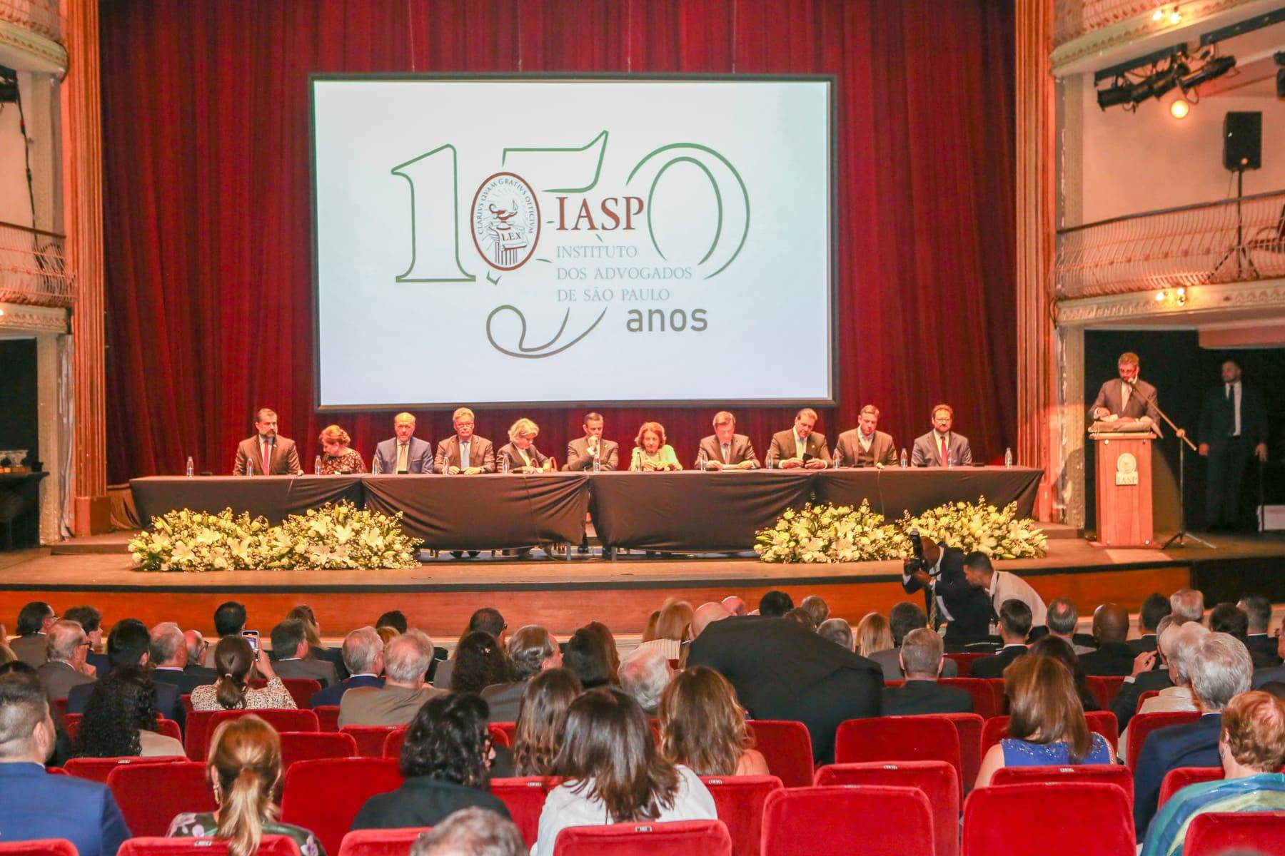 Muita emoção na solenidade que comemorou os 150 anos do Instituto dos Advogados de São Paulo (IASP) na noite de segunda-feira, dia 11, realizada no Theatro São Pedro, na Barra Funda, em São Paulo. Com a cúpula do Poder Judiciário paulista presente ao evento e representantes da advocacia, do Direito, associados e associadas do Instituto, o presidente Renato de Mello Jorge Silveira, em seu discurso emocionado, agradeceu “amigos e companheiros que tornaram menos solitária a missão de conduzir esse Instituto. São vocês o coração desse dia. O IASP do passado e do presente está perenizado. Se seu passado foi rico, seu futuro se avizinha promissor”.
