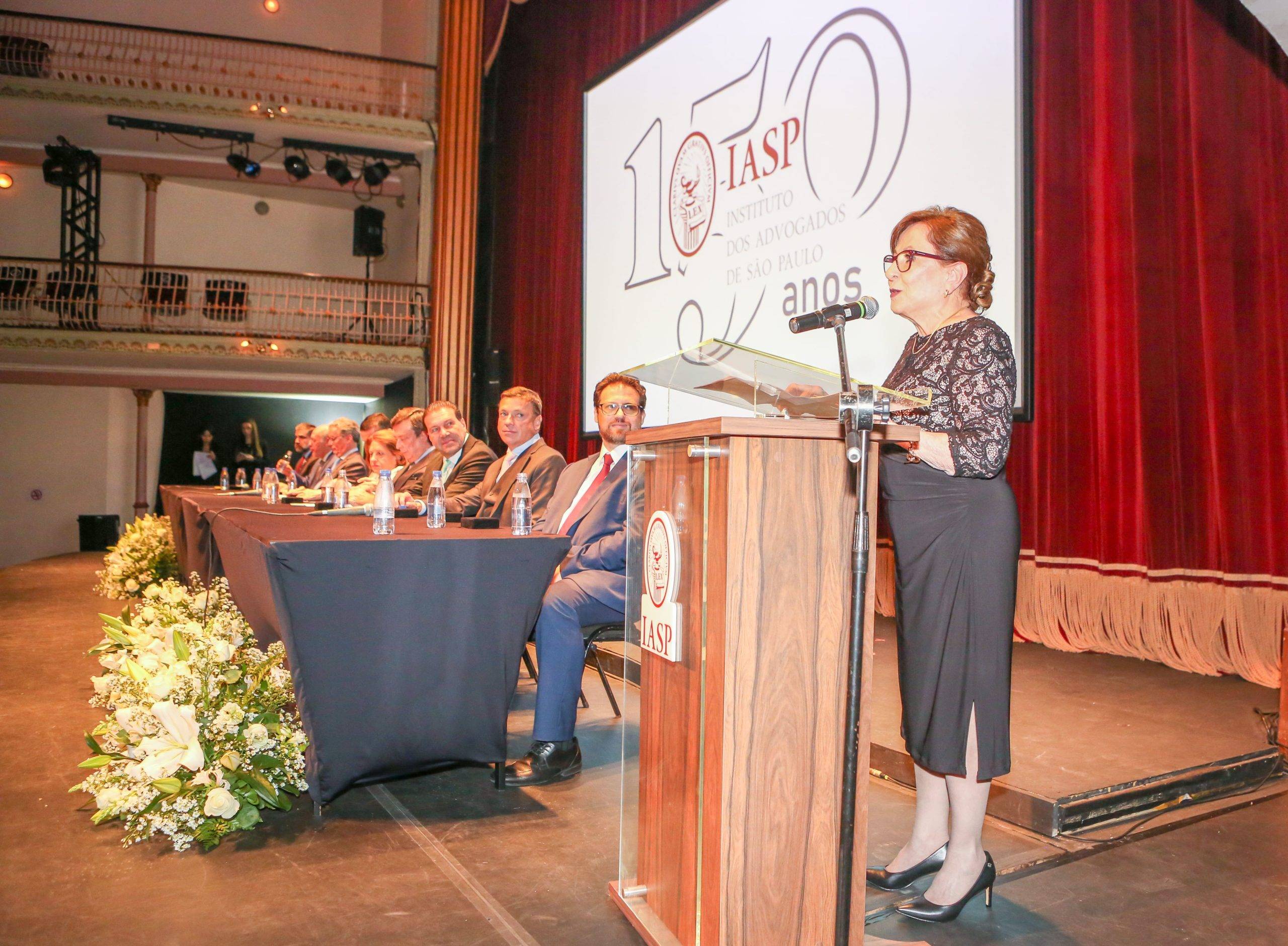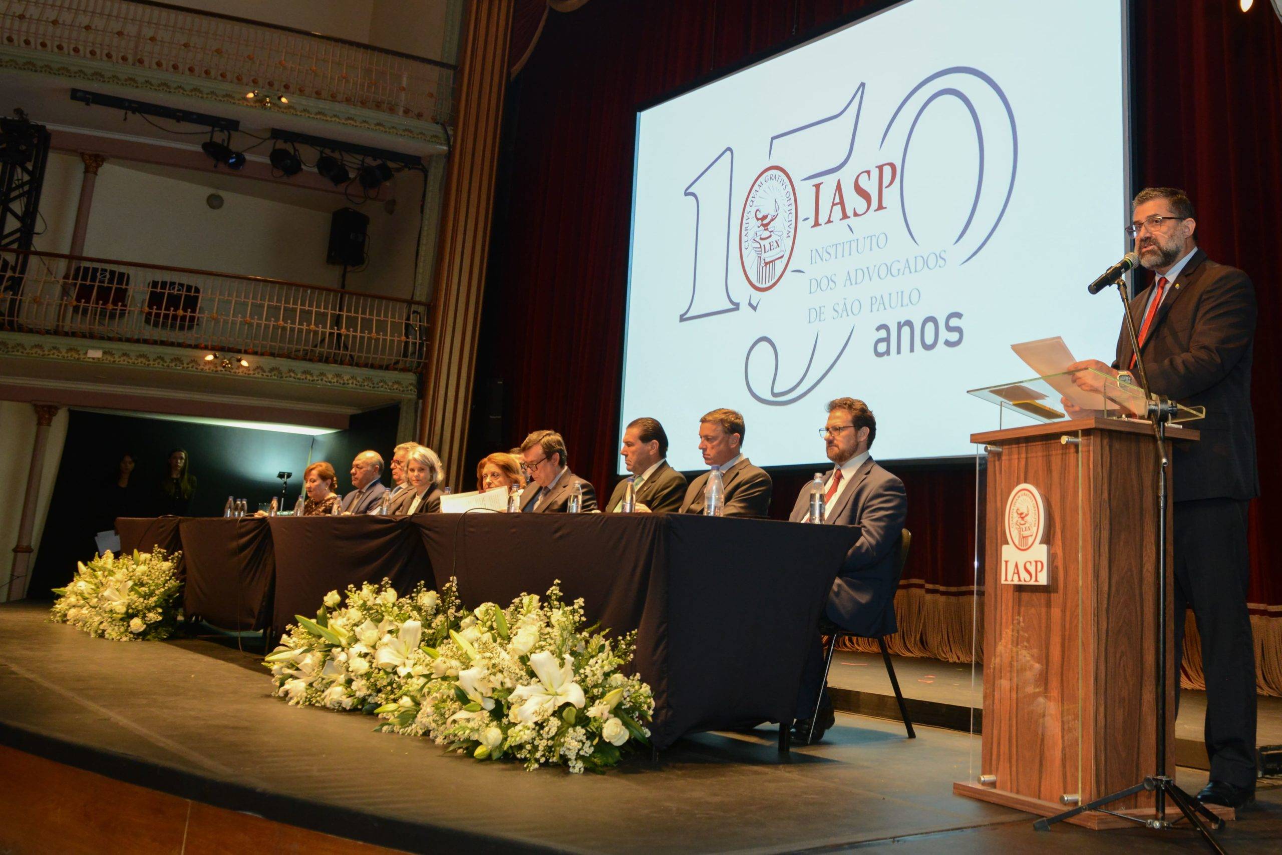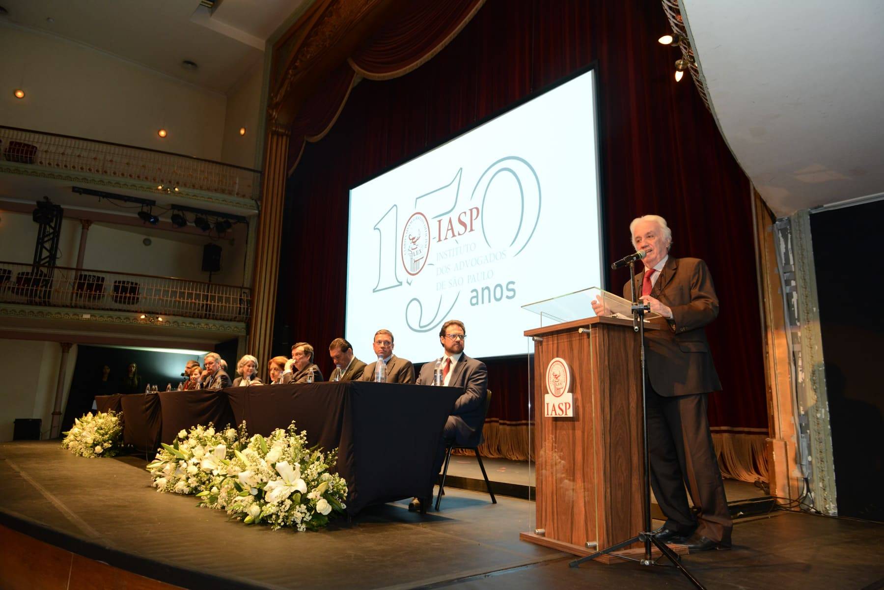 Muita emoção na solenidade que comemorou os 150 anos do Instituto dos Advogados de São Paulo (IASP) na noite de segunda-feira, dia 11, realizada no Theatro São Pedro, na Barra Funda, em São Paulo. Com a cúpula do Poder Judiciário paulista presente ao evento e representantes da advocacia, do Direito, associados e associadas do Instituto, o presidente Renato de Mello Jorge Silveira, em seu discurso emocionado, agradeceu “amigos e companheiros que tornaram menos solitária a missão de conduzir esse Instituto. São vocês o coração desse dia. O IASP do passado e do presente está perenizado. Se seu passado foi rico, seu futuro se avizinha promissor”.