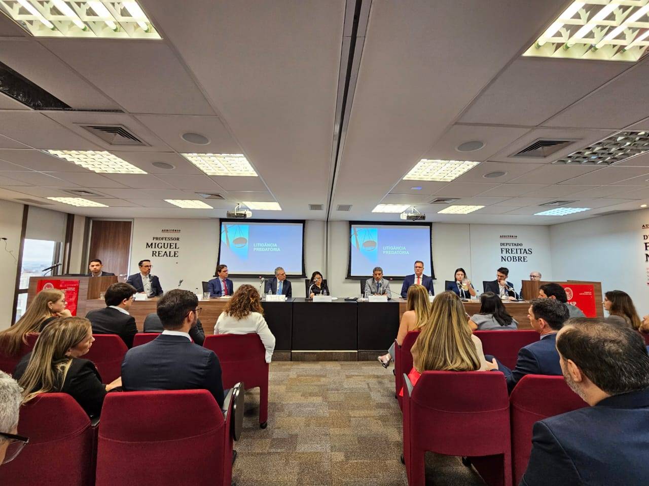 O uso abusivo do Sistema de Justiça em litigâncias predatórias massivas, utilizadas como um negócio, viu crescer na última quarta-feira (dia 19) uma verdadeira barreira contra esse modelo no Instituto dos Advogados de São Paulo (IASP). O evento Litigância Predatória: Compreensão e Caminhos Possíveis, que se destacou pelo recorde de 200 pessoas no auditório, na sede do Instituto, trouxe uma perspectiva mais crítica sobre o tema que abarrota tribunais. A mesa de abertura contou com a presença de membros do IASP, incluindo o presidente Diogo Leonardo Machado de Melo e o presidente da Comissão de Direito e Economia, Luciano Benetti Timm.