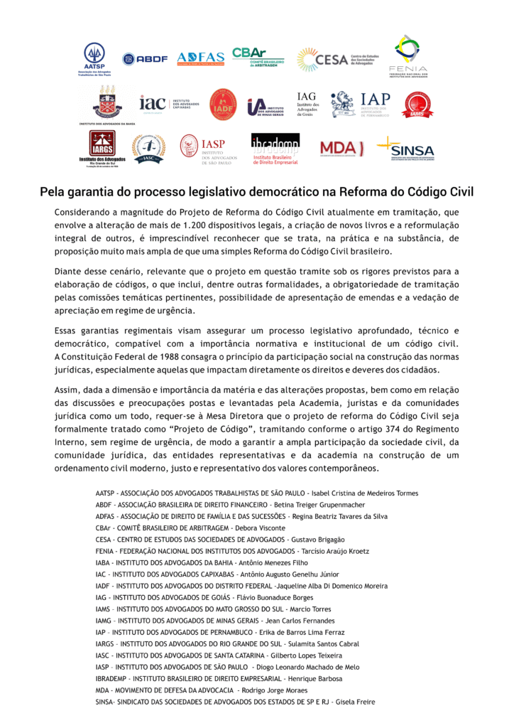 O Instituto dos Advogados de São Paulo (IASP), fiel ao seu compromisso com a defesa do Estado de Direito e a valorização do processo legislativo democrático, subscreveu, juntamente com importantes entidades do meio jurídico, manifesto público em defesa da tramitação adequada e regular do Projeto de Reforma do Código Civil atualmente em análise no Congresso Nacional.