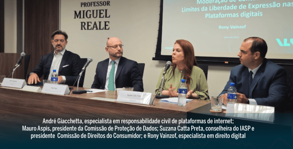 Vainzof defendeu o conceito de “devido processo informacional” como base para qualquer sistema legítimo de moderação, e trouxe exemplos internacionais como o Digital Services Act europeu e o NetzDG alemão, além de casos brasileiros em debate no STF e STJ, enfatizando a importância de um modelo regulatório baseado em conformidade, transparência e equilíbrio.