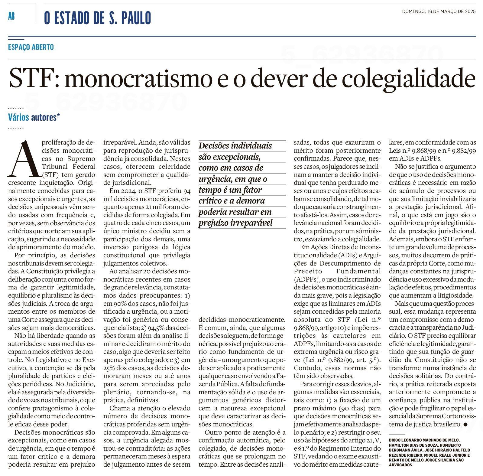 Publicado em: O ESTADO DE S. PAULO – ESPAÇO ABERTO- pág.: A08. Dom, 16 de Março de 2025