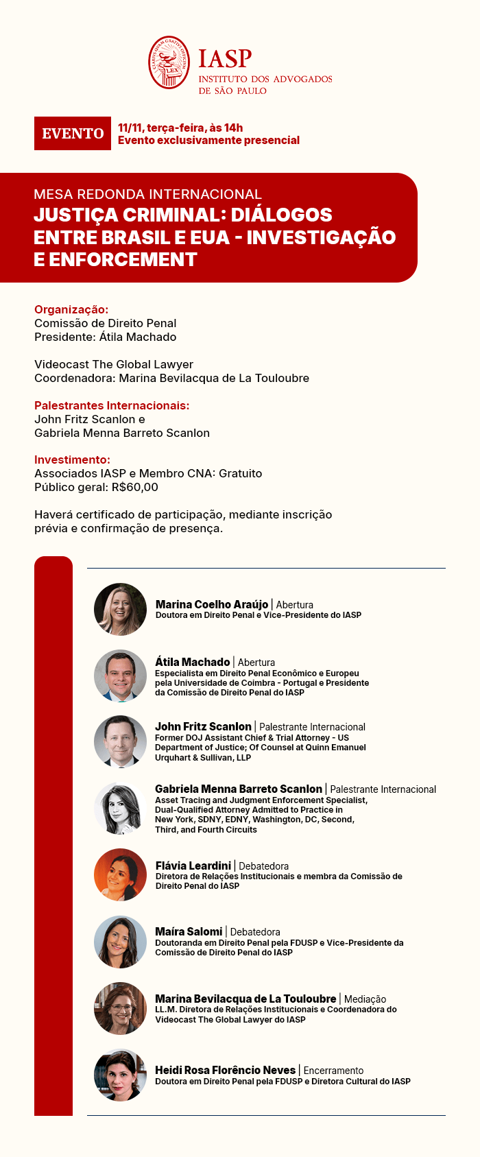 Investimento: Associados IASP e Membro CNA: Gratuito | Público geral: R$60,00