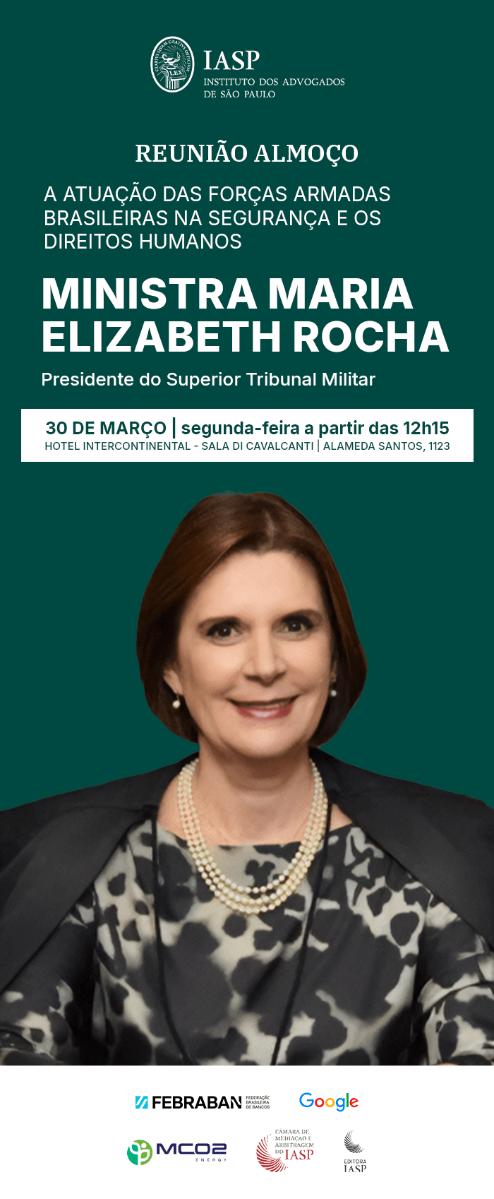 O palestrante convidado pelo IASP é a Ministra Maria Elizabeth Rocha, Presidente do Superior Tribunal Militar.