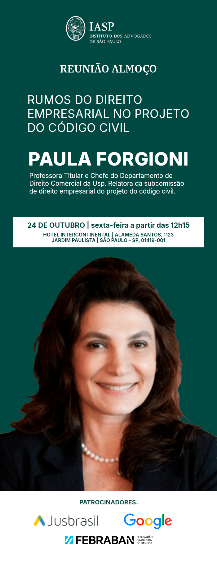 A palestrante convidada pelo IASP é Paula Forgioni, Professora Titular e Chefe do Departamento de Direito Comercial da USP. Relatora da subcomissão de direito empresarial do projeto do código civil.